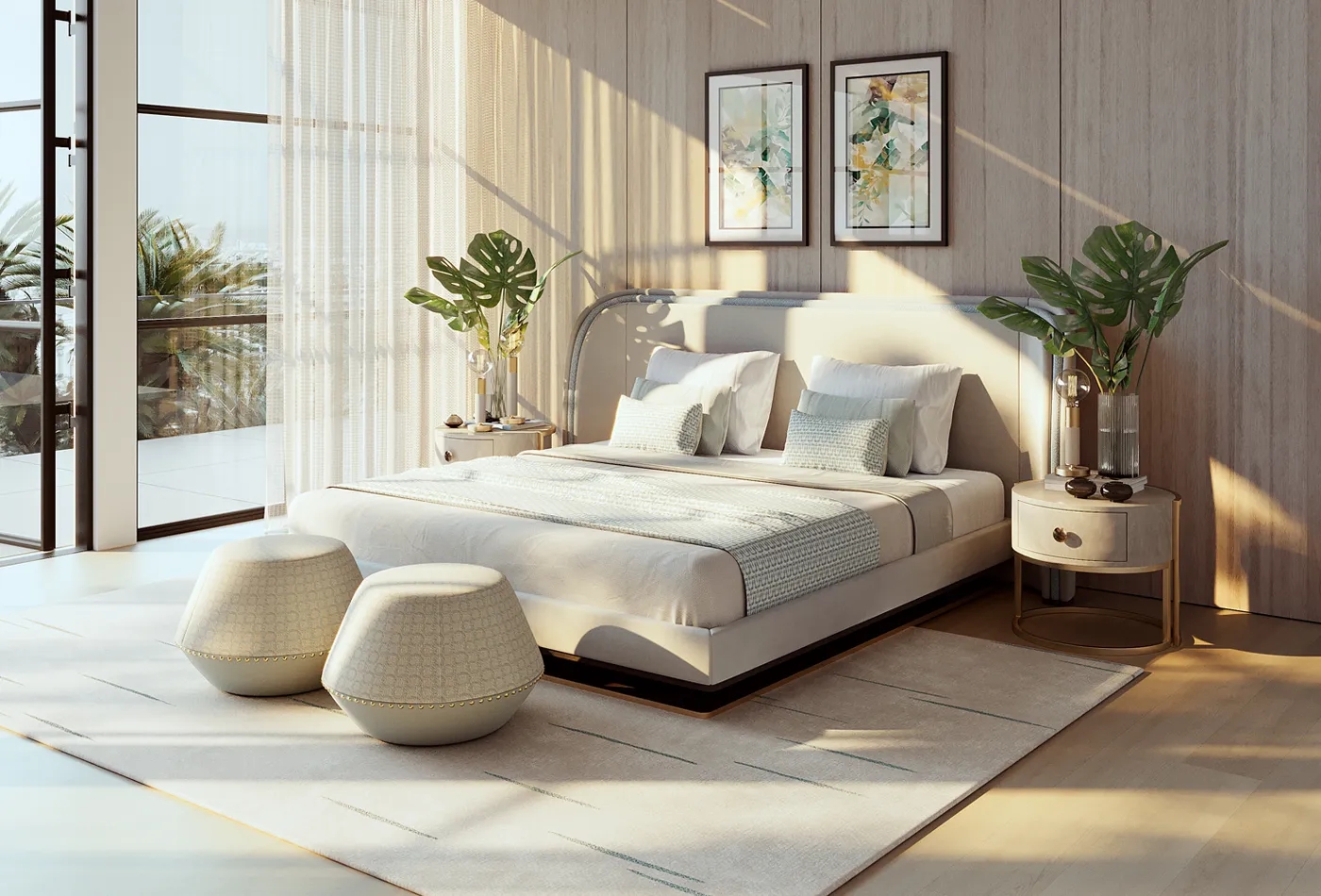 A good place to start is with your dream bed – this will set the tone for the rest of the space. For example, a modern four-poster such as our ANTIBES design will add instant wow-factor; our CALABRIA bed, with its wraparound screen, will up the cosy factor by creating the impression of a room within a room; or opt for a design with a statement headboard, such the retro scalloped design of our SAMARA bed.