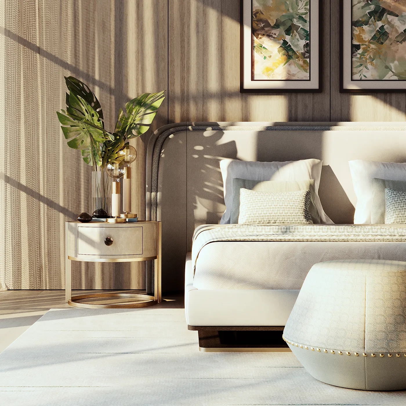 Bedside, circular CABOCHON tables reimagined in brass and a cloudy wood veneer, add sculptural interest and provide a place for matching ASPEN table lamps and displays of leafy greens that link to the verdant view. A pair of drum-shaped NEW CASTLE stools placed at the foot of the bed amplify a pleasing sense of symmetry, while a botanical silk, viscose and lurex INVERNESS rug adds superior comfort underfoot, inviting you to kick off your shoes and relax.