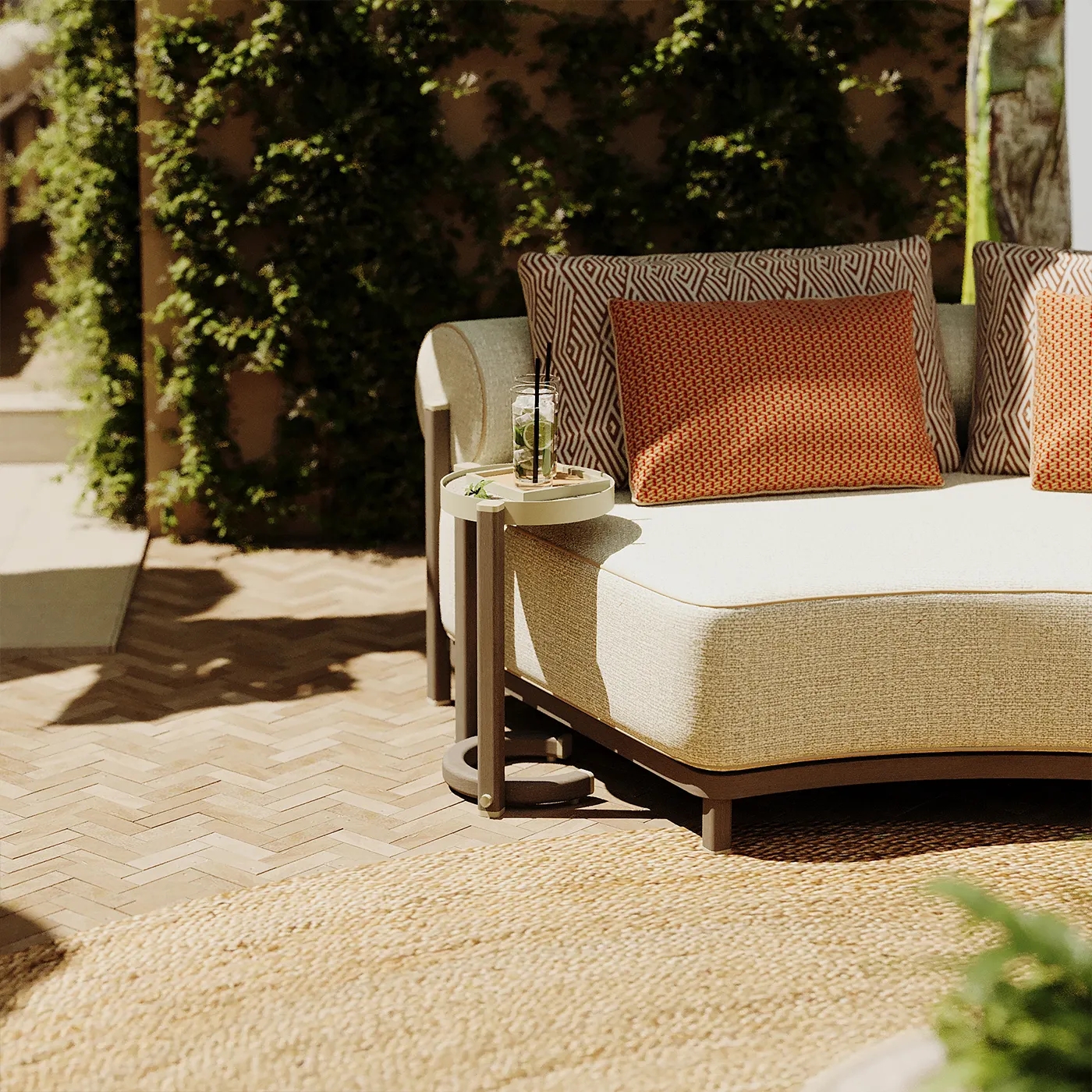 Pair the SAINT TROPEZ Round Sofa with our TUFI Side Tables. The simplistic design brings an industrial note to your outdoor space. They slot together perfectly, too, so you can keep your patio pristine. Place them on a raffia rug as the centrepiece to your open-air lounge. Then, finish the set up with our MARBELLA Stool. Made up of wood and leather, it blends perfectly with the neutral vibe of our SAINT TROPEZ collection.