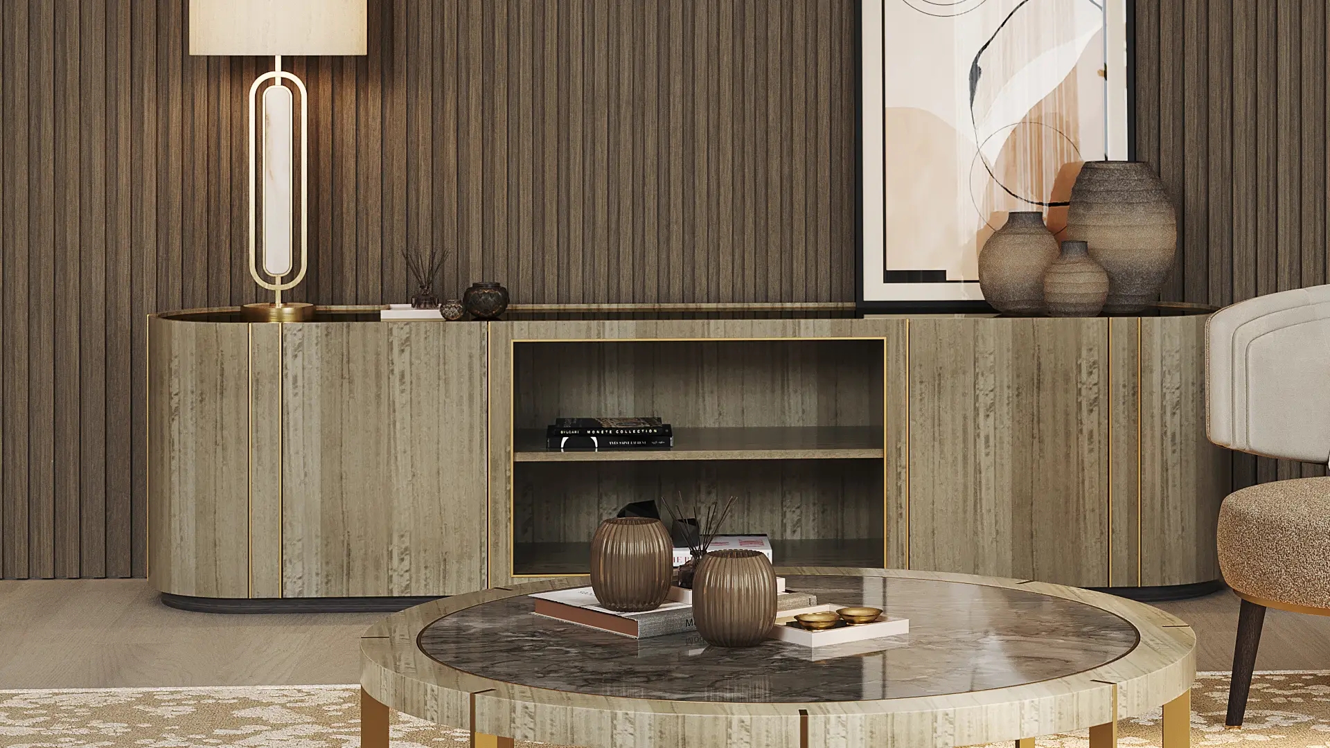 The most streamlined of our low-level TV units, the multi-purpose BERGEN merges two concealed cupboards with open shelves. A sinuous lozenge shape, it's made from wood veneer, brushed brass and features a surface of bronze mirror.