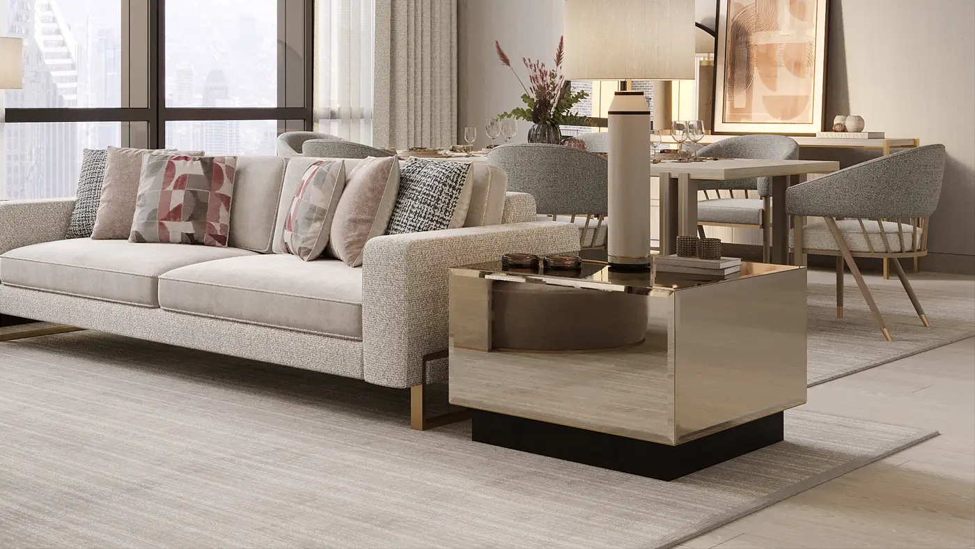 Clad in sections of bronze mirror that are softened with a bevelled edge, the GRANADA Coffee Table simultaneously blends in and stands out. Finely accented with brushed brass, the box-shaped design sits over a recessed base crafted from dark lacquered wood.