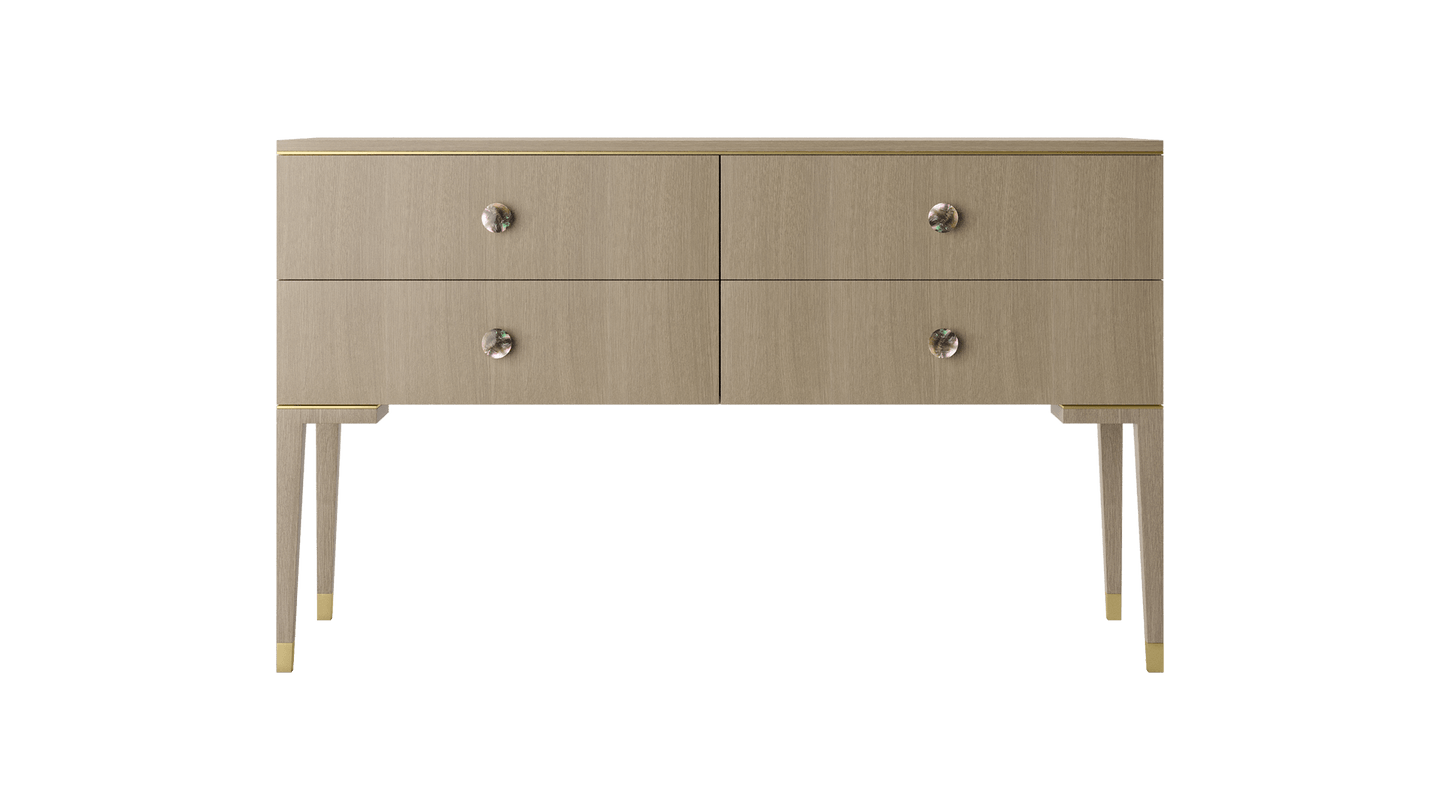 Part of a three-piece storage collection, the four-drawer MOONSTONE dresser's wood veneer structure is elevated with brushed-brass details that emphasise its subtle Art Deco silhouette, while circular handles finished with black mother-of-pearl provide a final flourish.