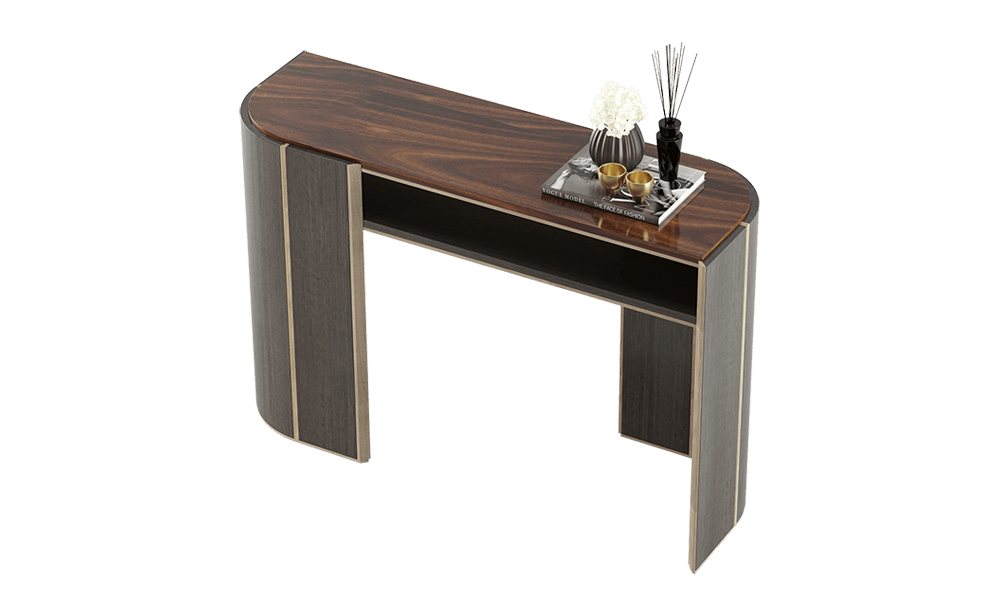 "Overlapping forms and sinuous curves add interest to the alluring OKAYAMA console, which layers different shades of solid wood and veneer to define its silhouette, while beautiful black stone run through with a rich white vein adds interest at the surface.